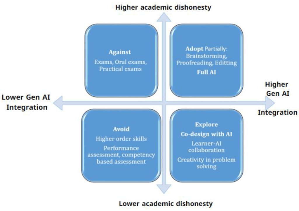 Image: The Against, Avoid, Adopt, Explore (AAAE) framework posed as a theoretical framework to adopt AI resilient assessments. (Khlaif et al, 2025)